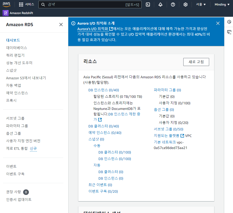 AWS에 로그인 후 RDS를 검색해 대시보드로 진입한다. 이후 메뉴바의 '데이터베이스'를 클릭한다.