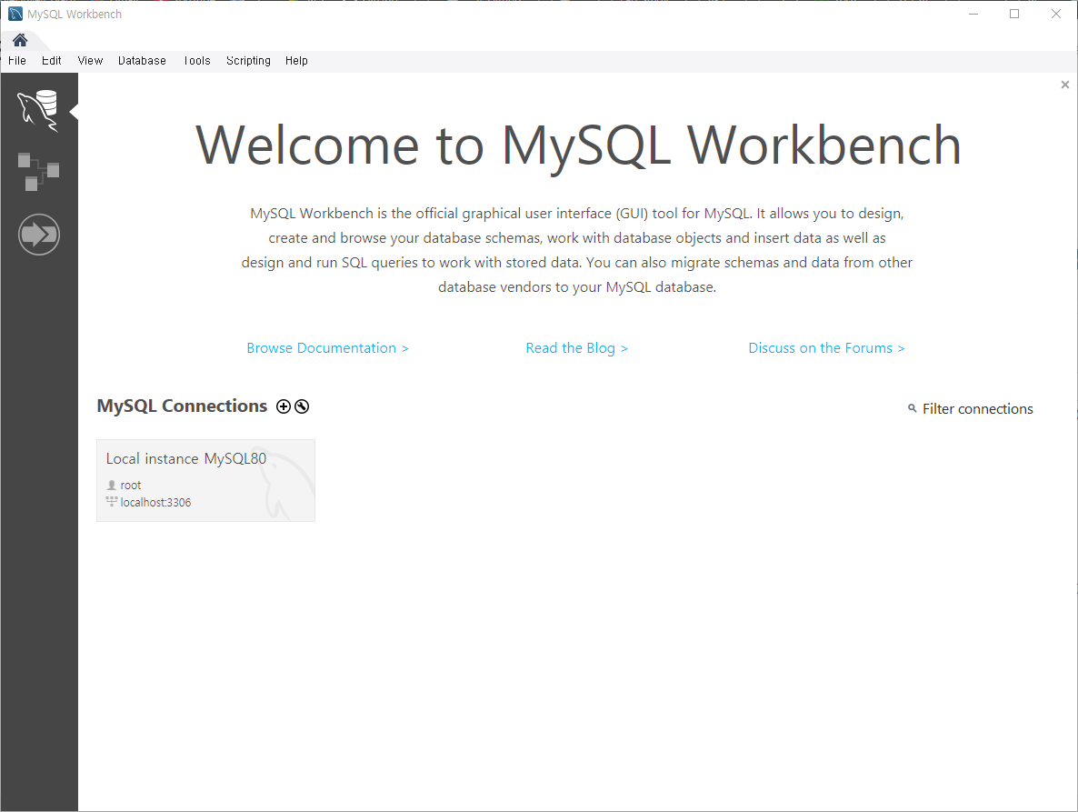 MySQL Connections 오른쪽에 있는 '+' 버튼을 눌러 연결을 시도한다.