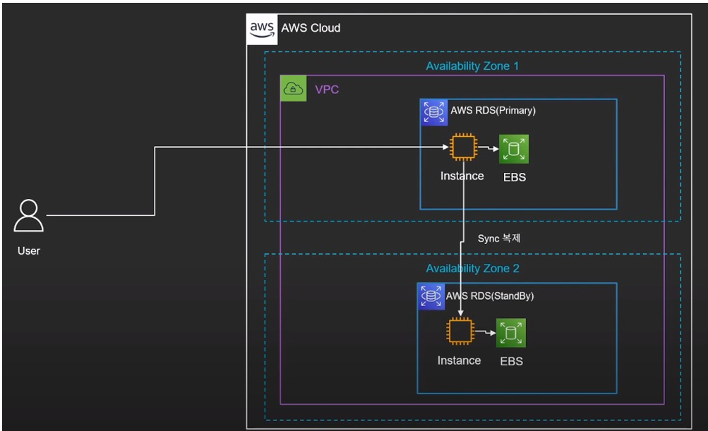 RDS는 main이 되는 Primary와 데이터 손실 방지용 StandBy 2개로 구성이 되어 있으며, 그 내부에는 인스턴스(서버)와 실질적으로 데이터를 저장하는 EBS로 이루어져 있다.