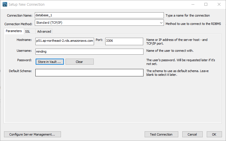 - Username, Password: 위에서 DB 생성시 설정한 ID/PW, PW은 'Store in Vault' 눌러 입력