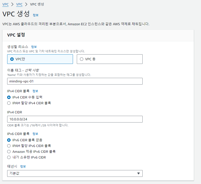VPC 서비스에 진입해 이름과 CIDR을 지정해주면 기본적인 VPC를 생성할 수 있다. 만약 생성할 리소스에서 'VPC 등'을 선택한다면,