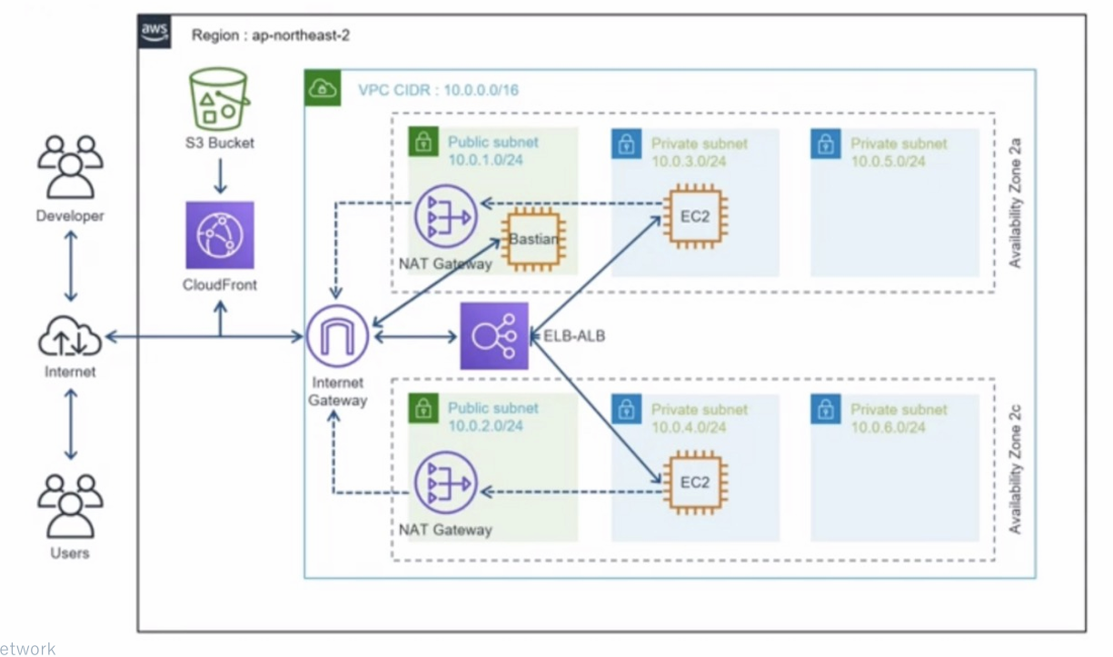 - 다이어그램에서 보여지는 두 개의 가용 영역(AZ 2a, AZ 2c)은 AWS 리전 내에서 서로 다른 물리적 데이터 센터입니다. 각각의 가용 영역 내에 퍼블릭 및 프라이빗 서브넷이 존재하며, 가용성을 높이기 위해 리소스가 여러 가용 영역에 걸쳐 분산되어 있습니다.