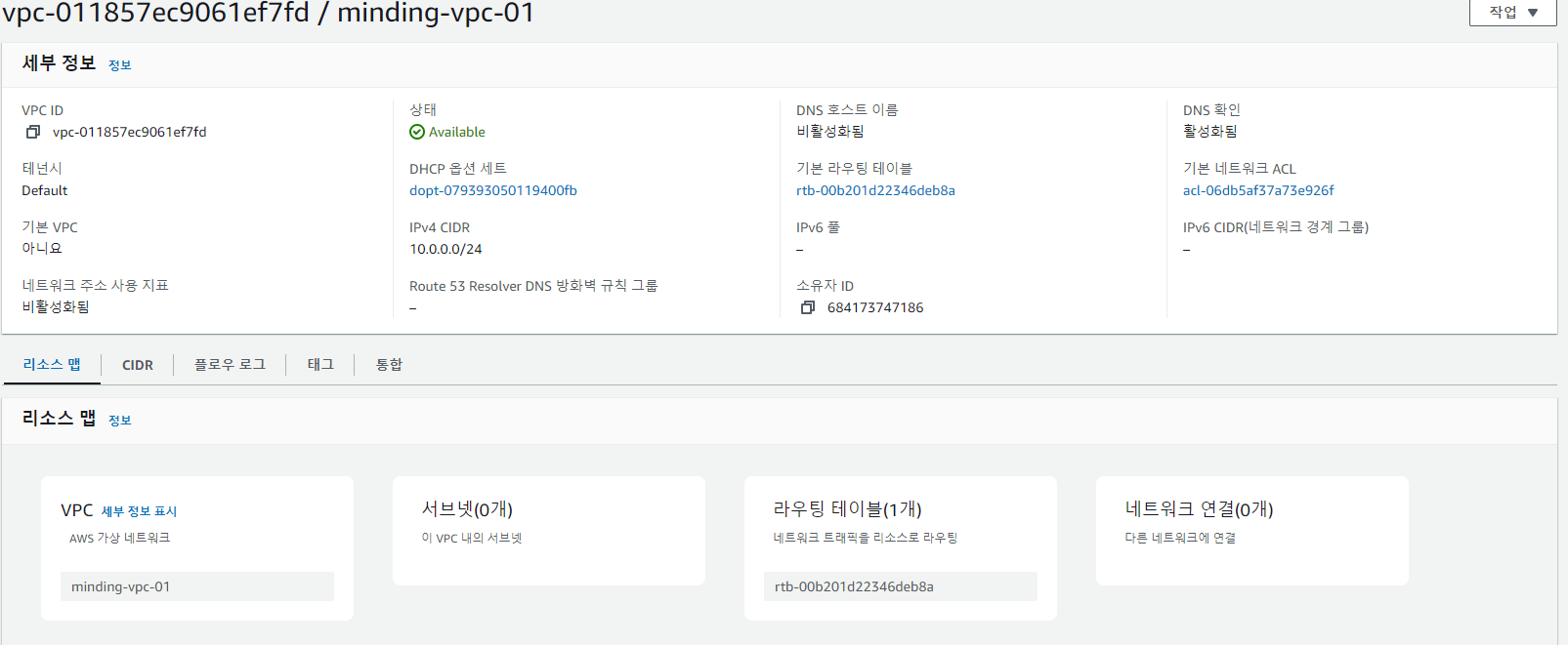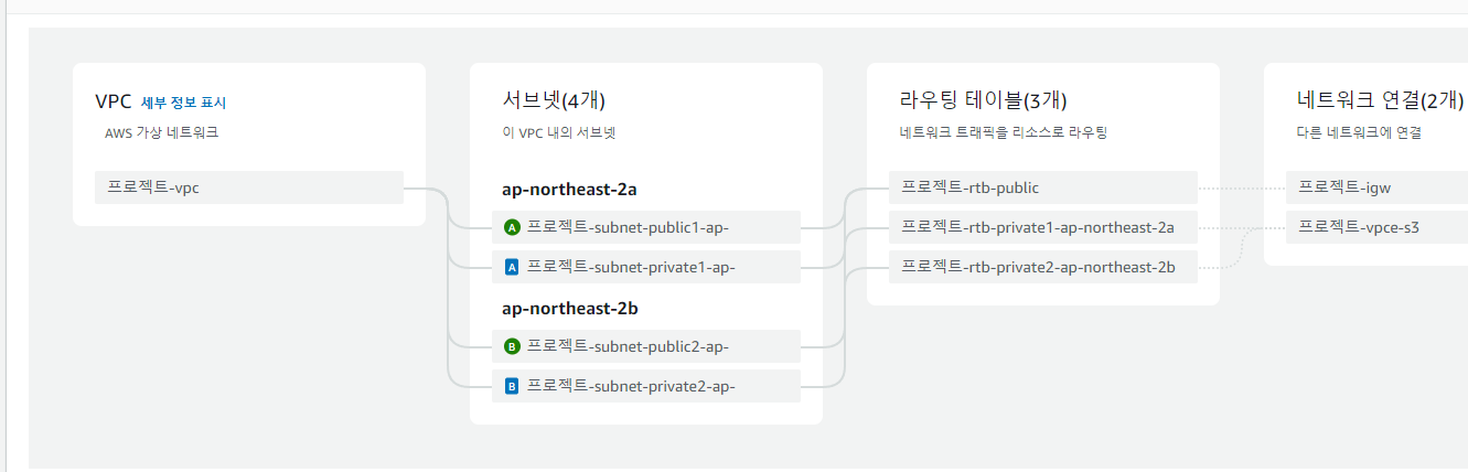 - VPC의 CIDR 블록은 10.0.0.0/16으로 설정되어 있습니다. 이는 이 VPC에서 사용할 수 있는 전체 IP 주소 범위를 나타냅니다. 이 범위 내에서 퍼블릭 서브넷과 프라이빗 서브넷이 나뉘어 있습니다.