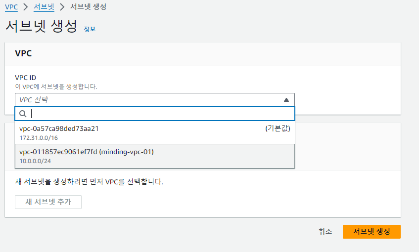 이런 식으로 vpc를 선택해 서브넷을 추가할 수 있다.