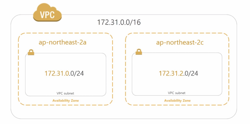 VPC에서 172.31.0.0/16으로 IP 범위를 설정하고, 2개의 서브넷을 만든 모습이다. 각 서브넷의 host영역을 결정하는 '/' 뒤의 숫자는 VPC의 IP 범위를 설정하는 숫자보다 작을 수 없다.