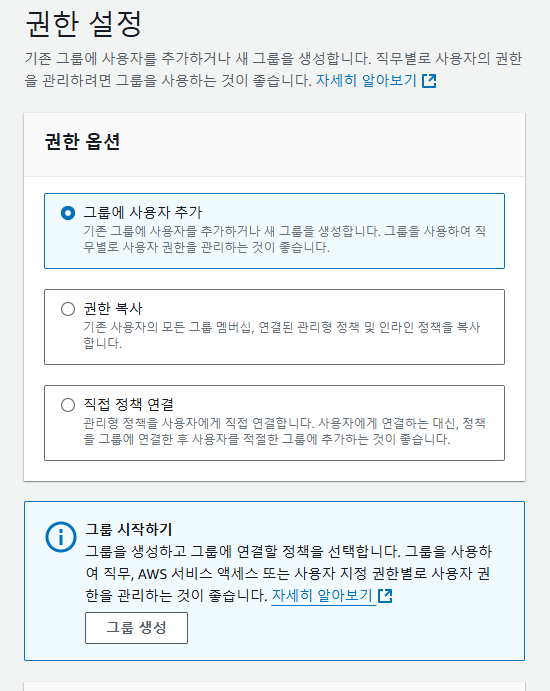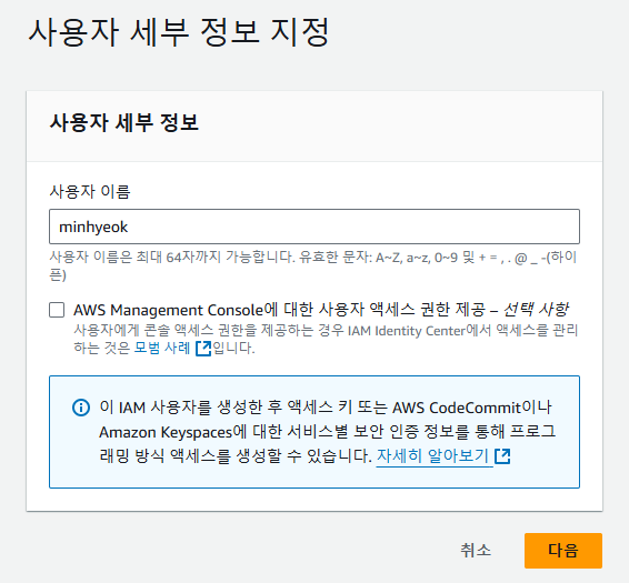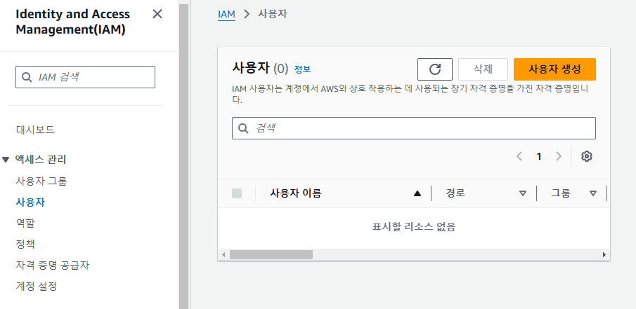 루트 계정으로 접속한 뒤 IAM의 사용자 항목으로 진입하면 사용자를 생성할 수 있다.