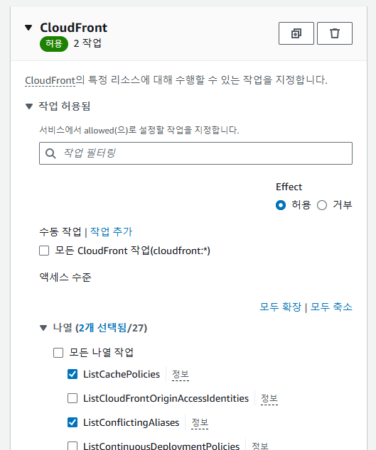 위와 같이 CloudFront 내에서 어떤 정책에 대해서 허용할 것인지 선택해 이 것 자체를 정책으로 생성할 수 있다. 또는 특정 서비스에 대한 모든 권한을 추가하는 정책을 새로 만들 수도 있을 것이다.