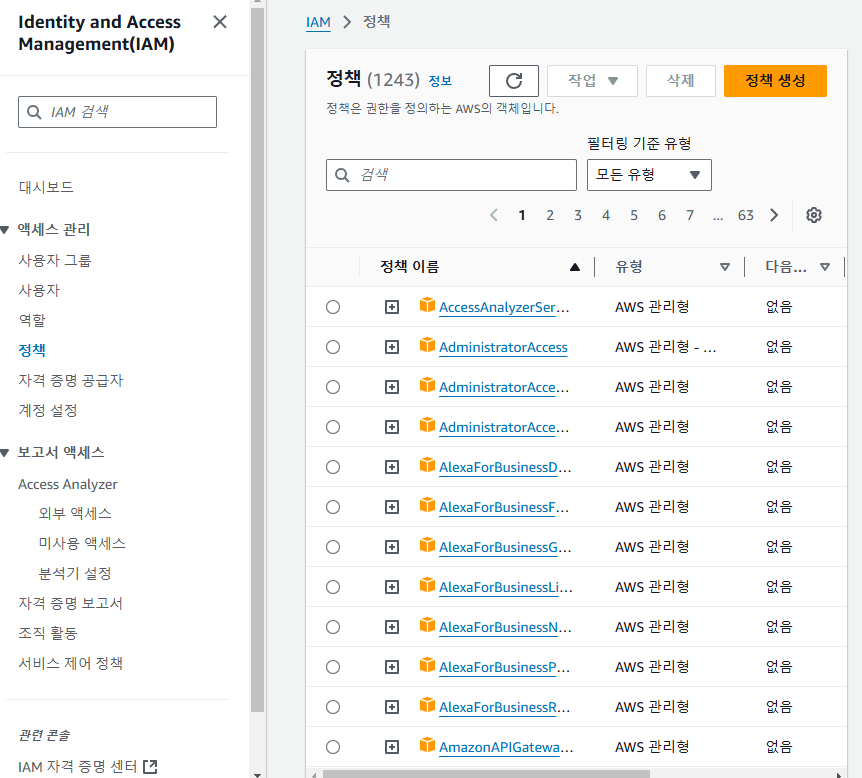 IAM - 정책 항목으로 진입해 '정책 생성'을 클릭한다.