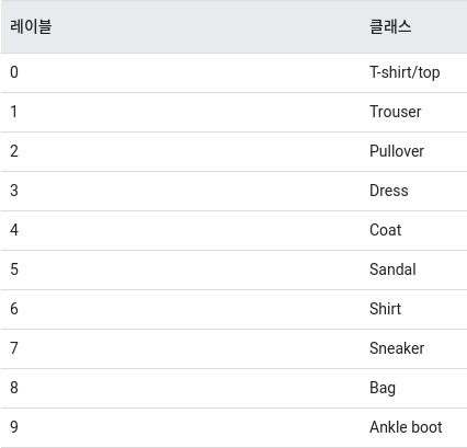 - 레이블은 0에서 9까지의 정수배열 (= 이미지(옷)의 클래스)