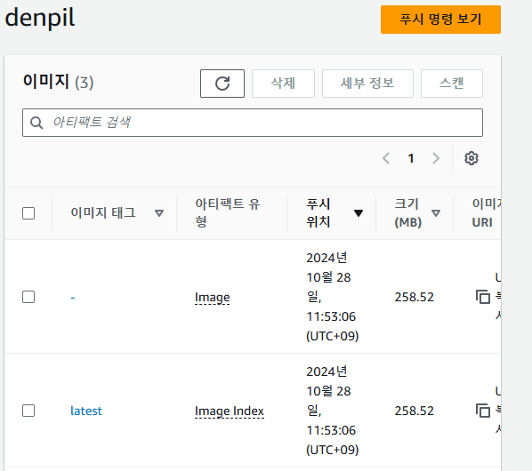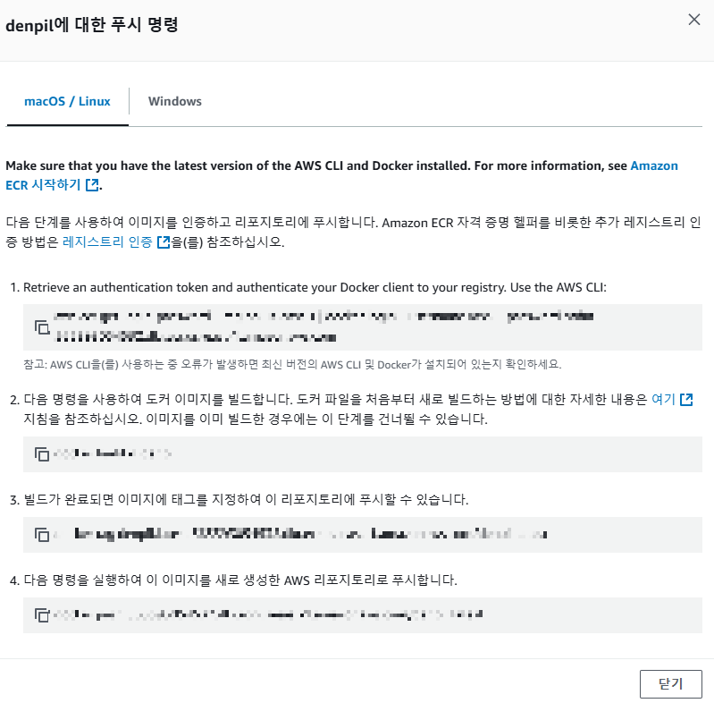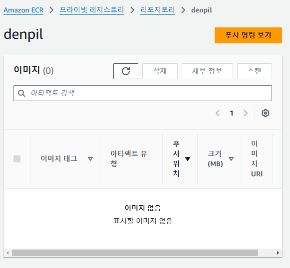 아직은 이미지가 없는 빈 레포지토리인 것을 볼 수 있다. 오른쪽 상단 '푸시 명령 보기'를 누르면 이미지를 업로드할 수 있는 방법을 알려준다.