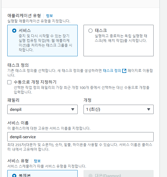 태스크에서 지정한 패밀리와 똑같이 지정해 준 다음 서비스를 생성한다.
