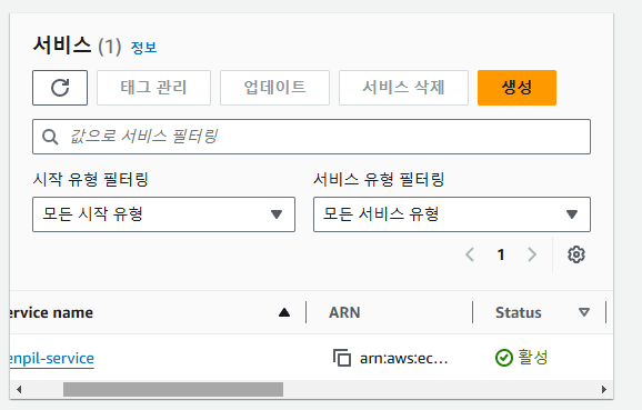 태스크가 실행 완료되었다면, 이제는 서비스를 생성할 차례다. 서비스 탭으로 이동해 서비스를 생성해보자.