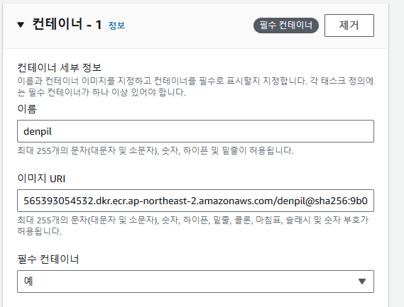 원하는 OS 환경 등을 지정한 뒤, 필수 컨테이너에 자신이 실행할 이미지 URI를 복사해 붙여넣고 생성한다. (ECR에서 확인 가능하다.)