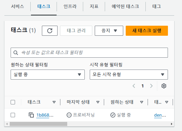 이제 다시 클러스터로 돌아와 위에서 등록한 태스크를 클러스터에서 실행한다. 태스크 탭의 '새 태스크 실행'을 눌러 해당 태스크를 실행시켜준다.