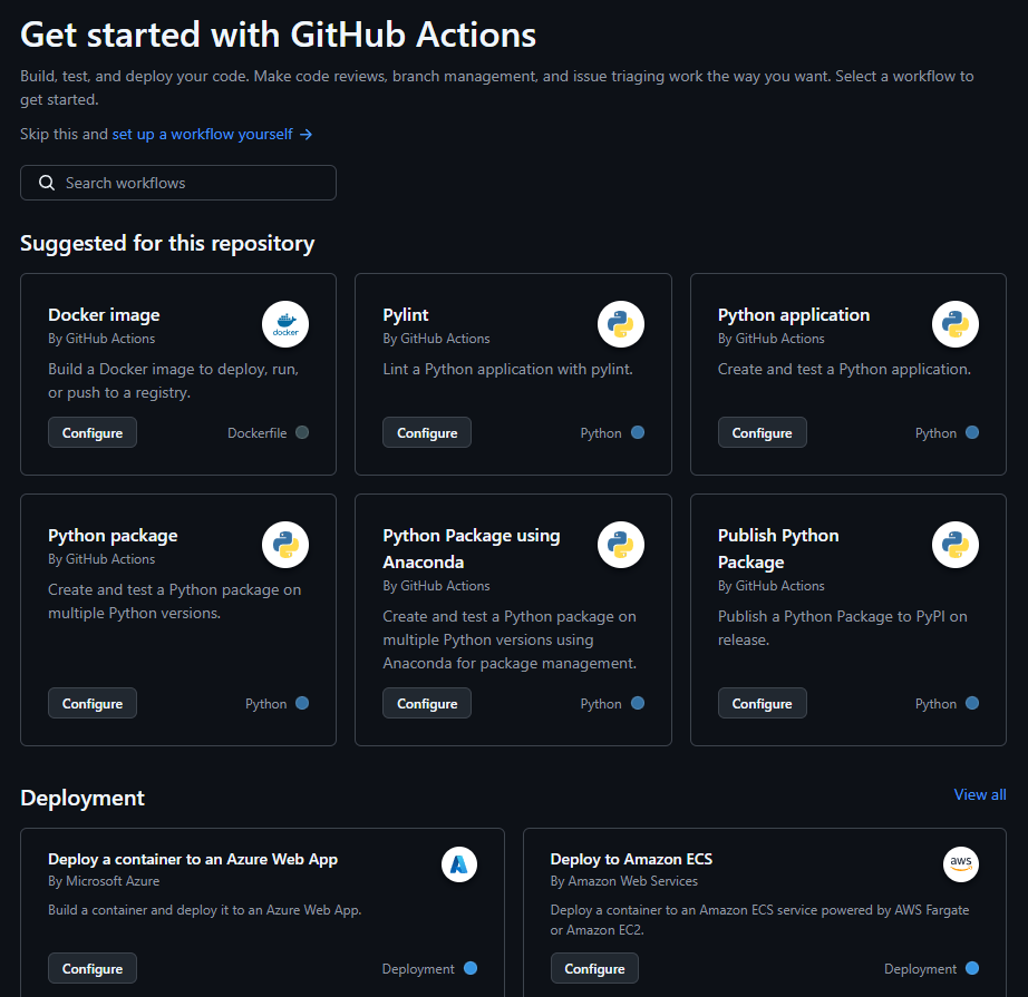 위 Actions 페이지에서 Python application이라는 CI tamplate을 선택한다.