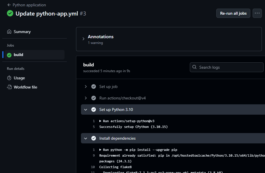 YAML 파일은 위와같이 구성했다. main 브런치만을 대상으로 하며, python 3.10 환경에서 작동한다. pip 명령어를 통해 종속성 라이브러리를 설치한 뒤, flake8과 python -m unittest 명령어를 통해 테스트를 진행한다.