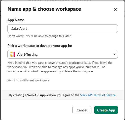 3. 앱 이름과 워크스페이스 선택 후 Create App 클릭