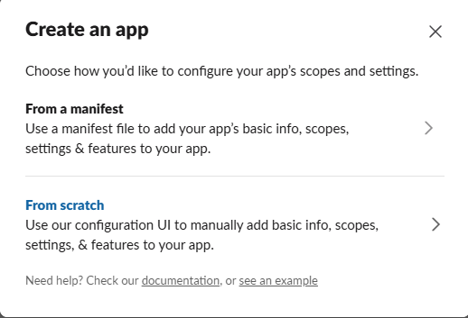 위 링크에 접속한 뒤, 'Create Your Slack app' 버튼을 눌러 아래와 같이 app을 생성한다.