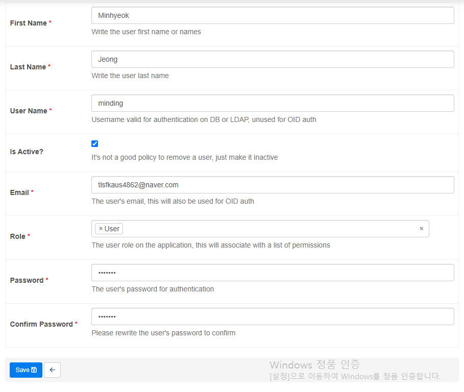 위와 같이 정보를 입력하고, Role에 'User'를 지정한다. (Admin 계정을 사용하는 것보다 이렇게 사용하는 것이 안전하다.)
