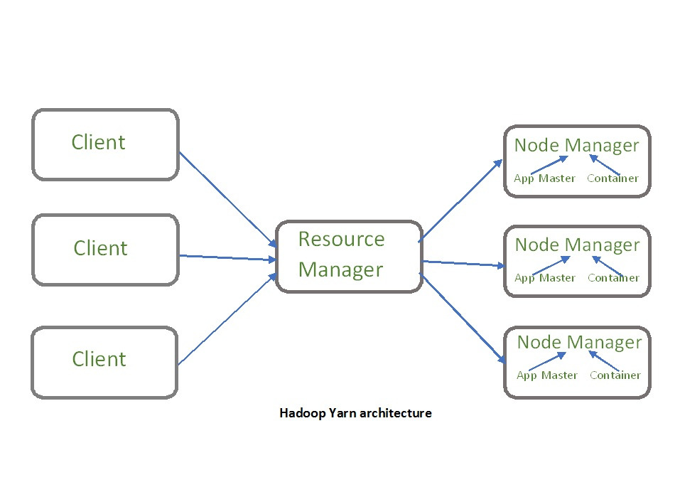 YARN의 구조는 위 그림과 같다. 마스터 노드라고 할 수 있는 'Resource Manager'와 그 아래 슬레이브 노드인 'Node Manager'가 있다. 노드 매니저들은 리소스 매니저의 요구에 따라 자신이 가지고 있는 자원을 일부 넘겨주는 역할을 한다.