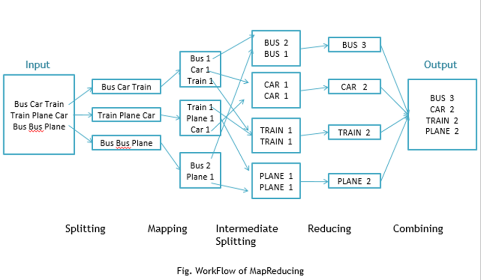 MapReduce로 단어를 세는 프로그램을 작동시켜본다고 가정하면, 위와 같은 흐름으로 나타난다.