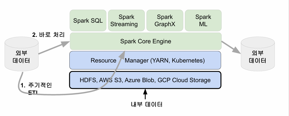 Spark는 기본적으로 Resource Manager라고 불리는 YARN, K8s 등 위에서 작동한다. 내부 데이터는 HDFS, AWS S3등에서 받아오는 형태이다. 외부에 있는 데이터(ex. RDS 등)는 주기적인 ETL을 통해서 최신화해 내부 데이터로 가져오거나, 필요할 때마다 바로 처리하는 방법을 사용한다. 이 처리 과정을 통해 외부 DB로 적재시키기도 한다.