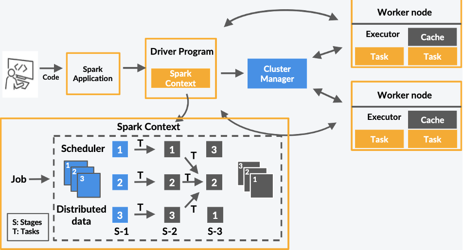 Spark는 크게 Driver와 Executer로 구분 지을 수 있다. Driver는 실행 코드의 마스터 역할, Executer는 실제 task를 실행하는 역할을 수행한다.