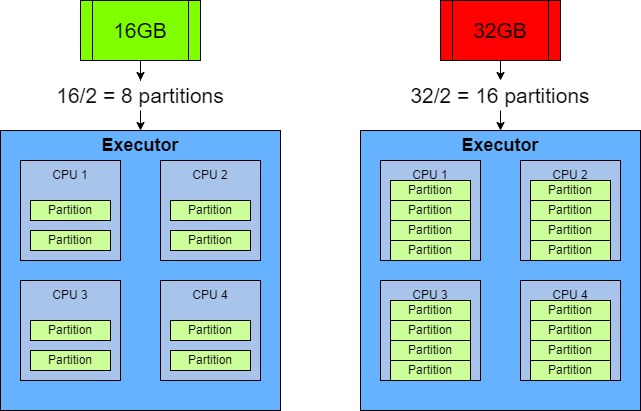 Hadoop Map의 데이터 블록처럼, Spark에서는 파티션(partition)이라고 불리는 데이터 처리 단위가 존재한다. 하둡과 마찬가지로 128MB의 기본크기를 가지고 있다. 이렇게 파티션 단위로 나눠진 데이터를 메모리에 로드하여 Executor를 배정하고, 각각 따로 동시에 처리한다.