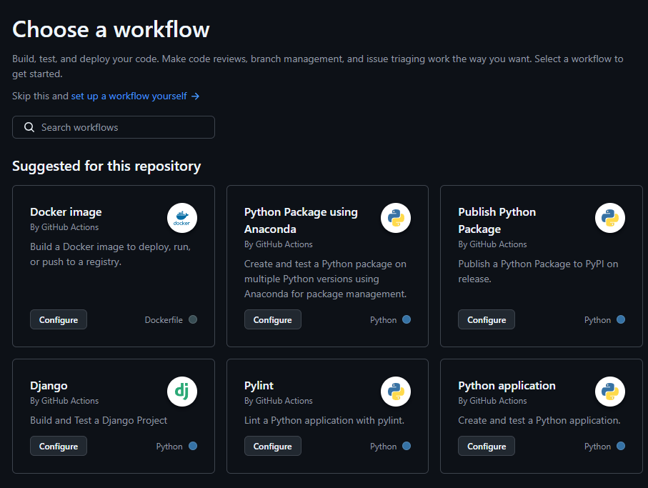 Github에서 제공하는 여러 확장기능을 사용할 수 있긴하지만, 나는 'set up a workflow yourself'를 통해 직접 코드를 작성했다.