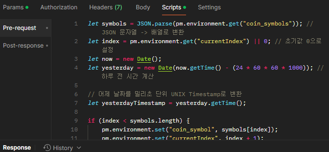 Pre-request 스크립트에서는 주로 API 요청 전 설정해야 할 환경변수들에 대한 코드다. 코드는 javascripts로 작성한다.