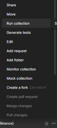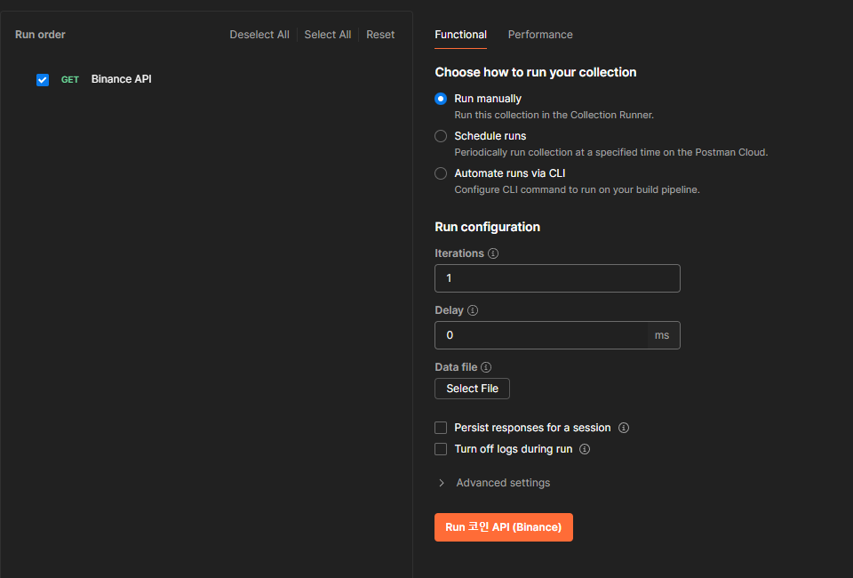테스트를 실행해보기 위해서는 해당 Collection의 추가 옵션(...)버튼을 누른 다음 'Run collection'을 클릭한 뒤,