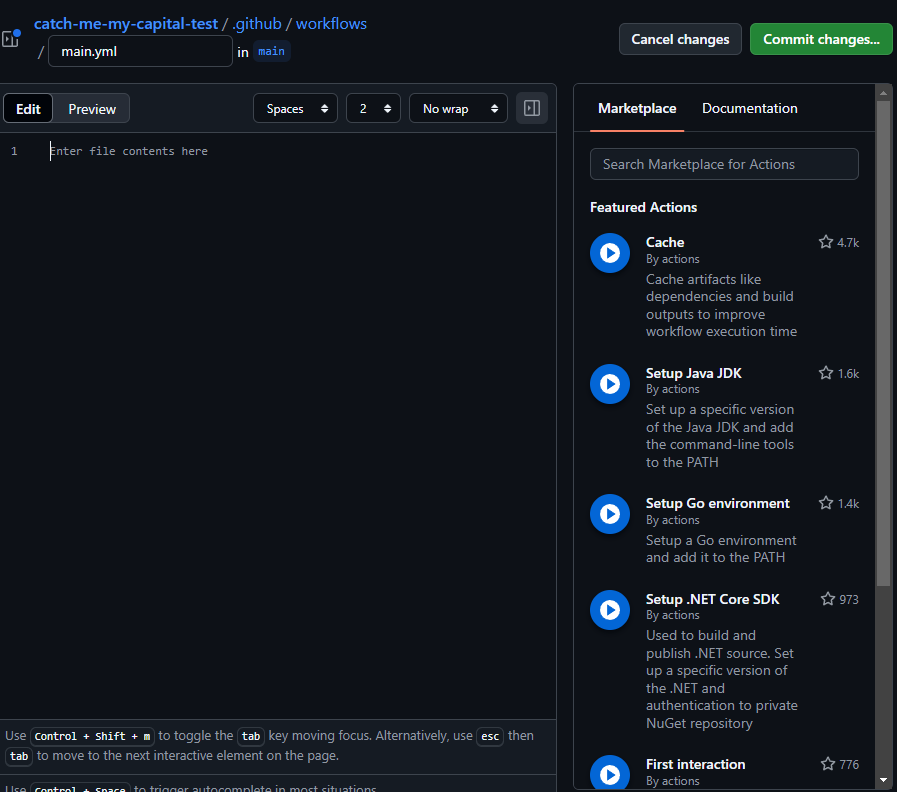 그러면 아래와 같이 .github/workflows 폴더 내 yml 파일을 작성할 수 있는 창이 노출된다.
