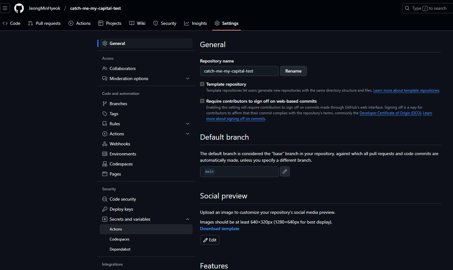 Settings > Secrets and variables > Actions > New repository secrets 경로를 통해 등록해줄 수 있다.