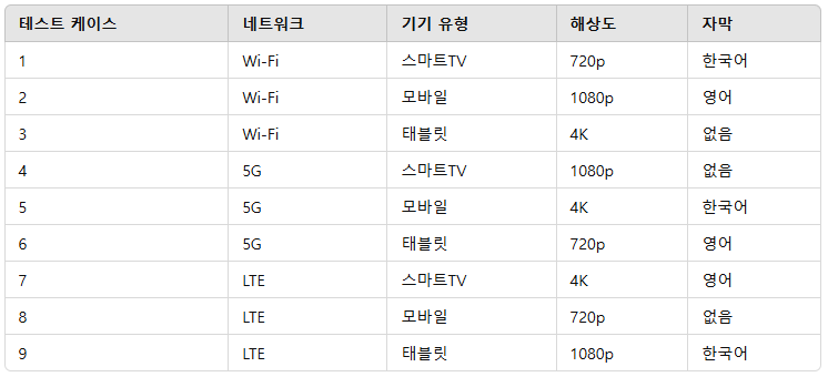 페어와이즈 기법은 각 변수의 가능한 값들이 최소한 한 번 이상 서로 조합되는 방식으로 TC를 도출하는 기법이다. 모든 조합을 테스트하지 않고도 효과적으로 커버리지를 확보할 수 있다. 예를 들어, OTT 서비스에서 아래와 같은 테스트 조건이 있다고 가정해보자.