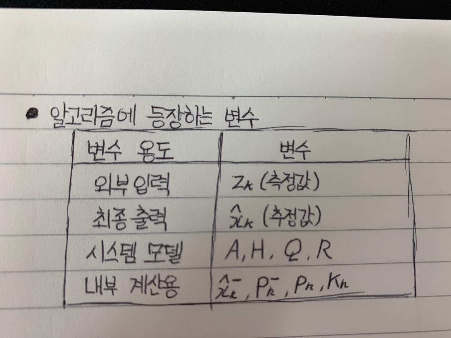 - 아래첨자 k는 칼만필터 알고리즘이 반복해서 수행된다는 의미