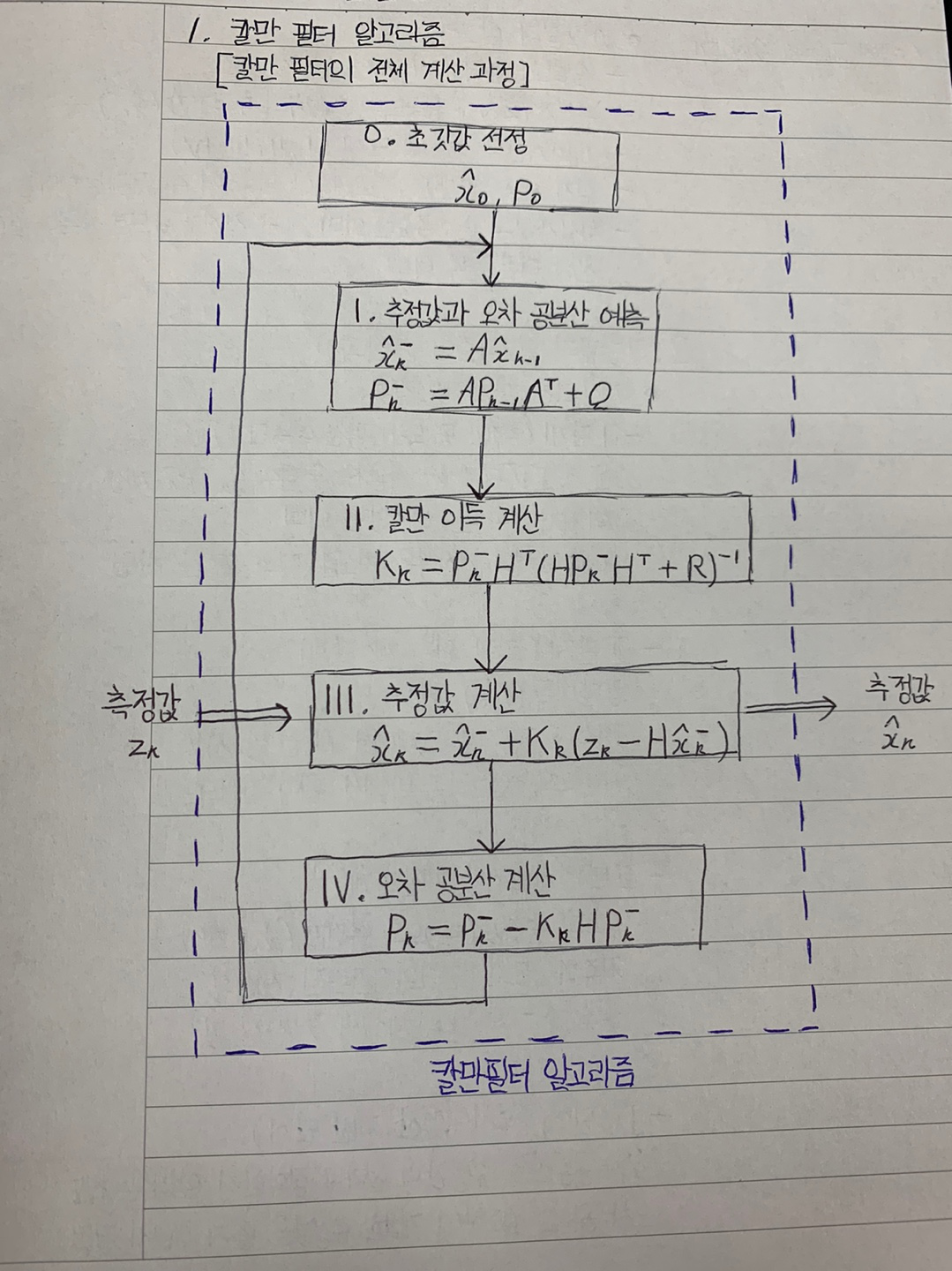 - 칼만 필터 : x hat k = (I - Kk)x hat - k + Kkzk