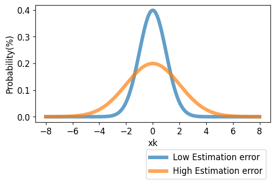 - 종 모양의 폭이 작으면 (Pk가 작으면) xk가 가질 수 있는 값이 평균(x hat k) 근처이므로 추정오차가 작음 (반대의 경우 추정오차 큼)