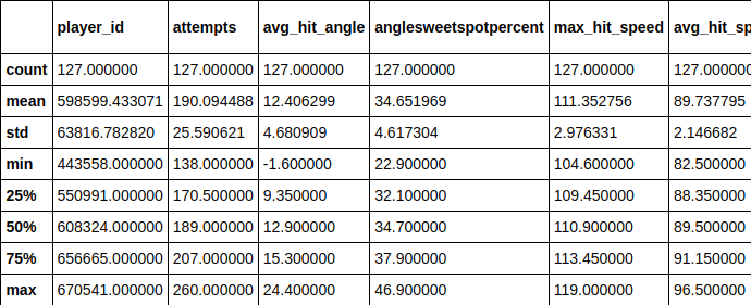 - fbld(플라이볼과 라인드라이브타구속도), ev95percent(95마일이상 타구속도 비율)도 눈여겨 볼 만함