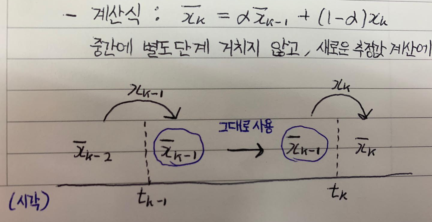 - 칼만필터는 1차 저주파통과필터와 달리 추정값 계산 시 직전 추정값을 바로 쓰지 않고 예측단계를 한번 더 거침
