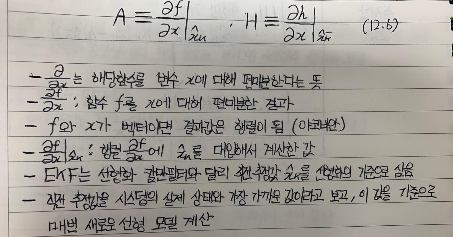 - [그림 12-1]의 EKF는 이산시스템 알고리즘이므로, 구현 시에는 시스템모델도 이산시스템으로 바꿔주어야 함