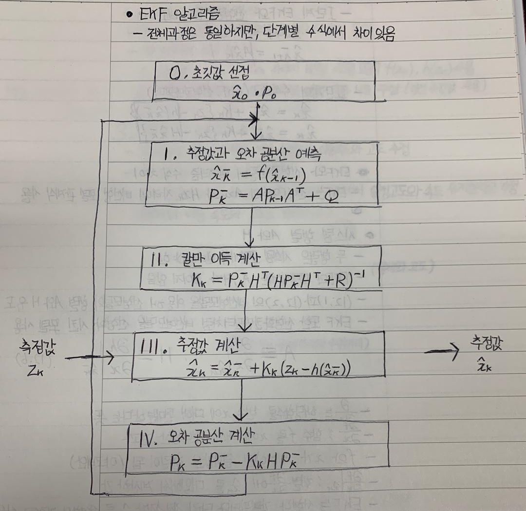- EKF는 선형칼만필터 알고리즘과 전체과정이 동일