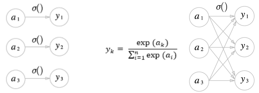 소프트맥스는 출력노드가 모든 입력노드의 영향을 받음