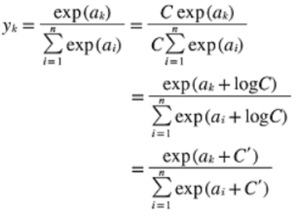 softmax의 지수함수 계산 시 어떤 정수를 더하거나 빼도 결과는 바뀌지 않음