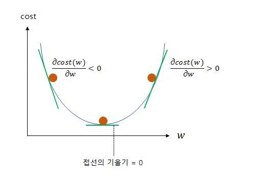 - 접선의 기울기가 0이 되는 지점이 cost가 최소화 되는 지점