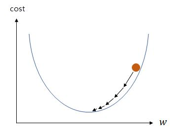 - 기울기가 음수일 때, w값은 증가하게 됨 --> 접선의 기울기가 0인 방향으로 w값이 조정