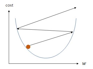 - 학습률이 지나치게 높으면 w의 값이 발산되어 최소값을 찾을 수 없음