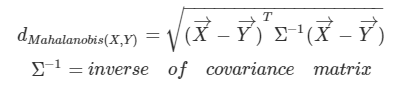 - 변수 간 상관관계를 고려한 거리 지표