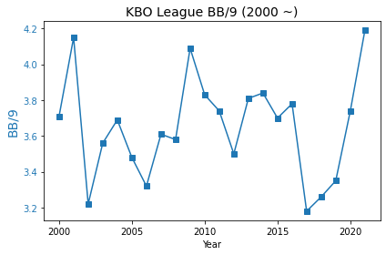 9이닝당 볼넷 허용 개수를 나타내는 BB/9이 리그 평균자책점과 리그 타율에 상반되는 지표였다. 2019 시즌까지는 BB/9의 전체적으로 리그 평균자책점과 리그 평균 타율의 그래프와 비슷한 흐름을 보였으나, 최근 두 시즌 볼넷 허용 개수가 급속하게 늘어나는 모습을 보였다. 2021 시즌에는 BB/9이 4.19로 최근 20년 중 가장 높은 수치를 기록하기도 했다. 공인구의 반발력 계수가 줄어들면서 타자들과 자신 있게 승부를 할 법도 한데, 오히려 볼넷 허용이 늘어났다는 것은 분명히 문제가 있는 일이다.